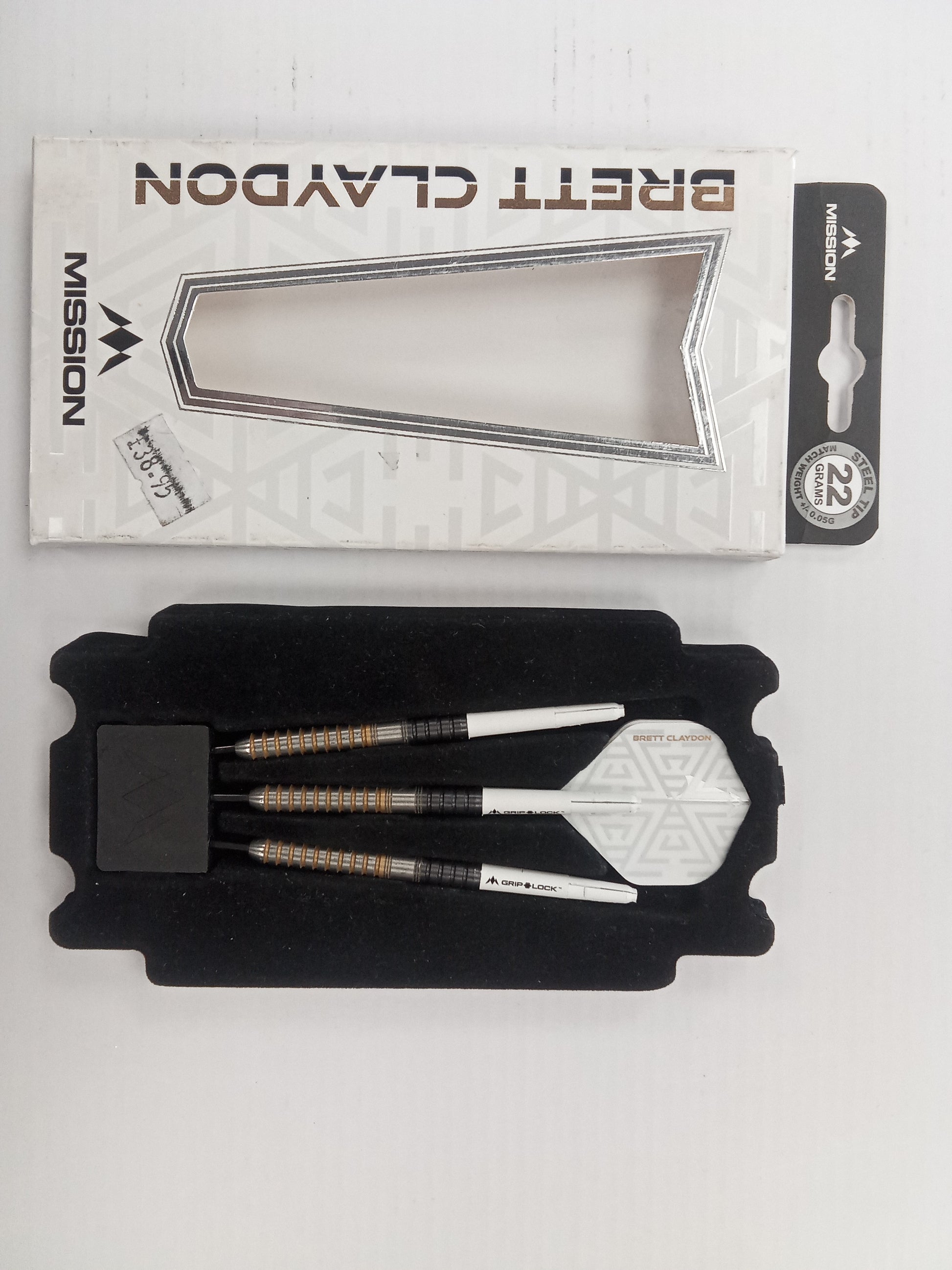 Mission Brett Claydon - Steel Tip Darts - 90% Tungsten. Features: 90% Tungsten Barrels, 1 Set of Mission Flights, 1 Set of Mission Shafts with S-Lock rings, Point Protector. Mission Brett Claydon Darts - Steel Tip - Black & Gold - 22g fantastic Pro Player Set