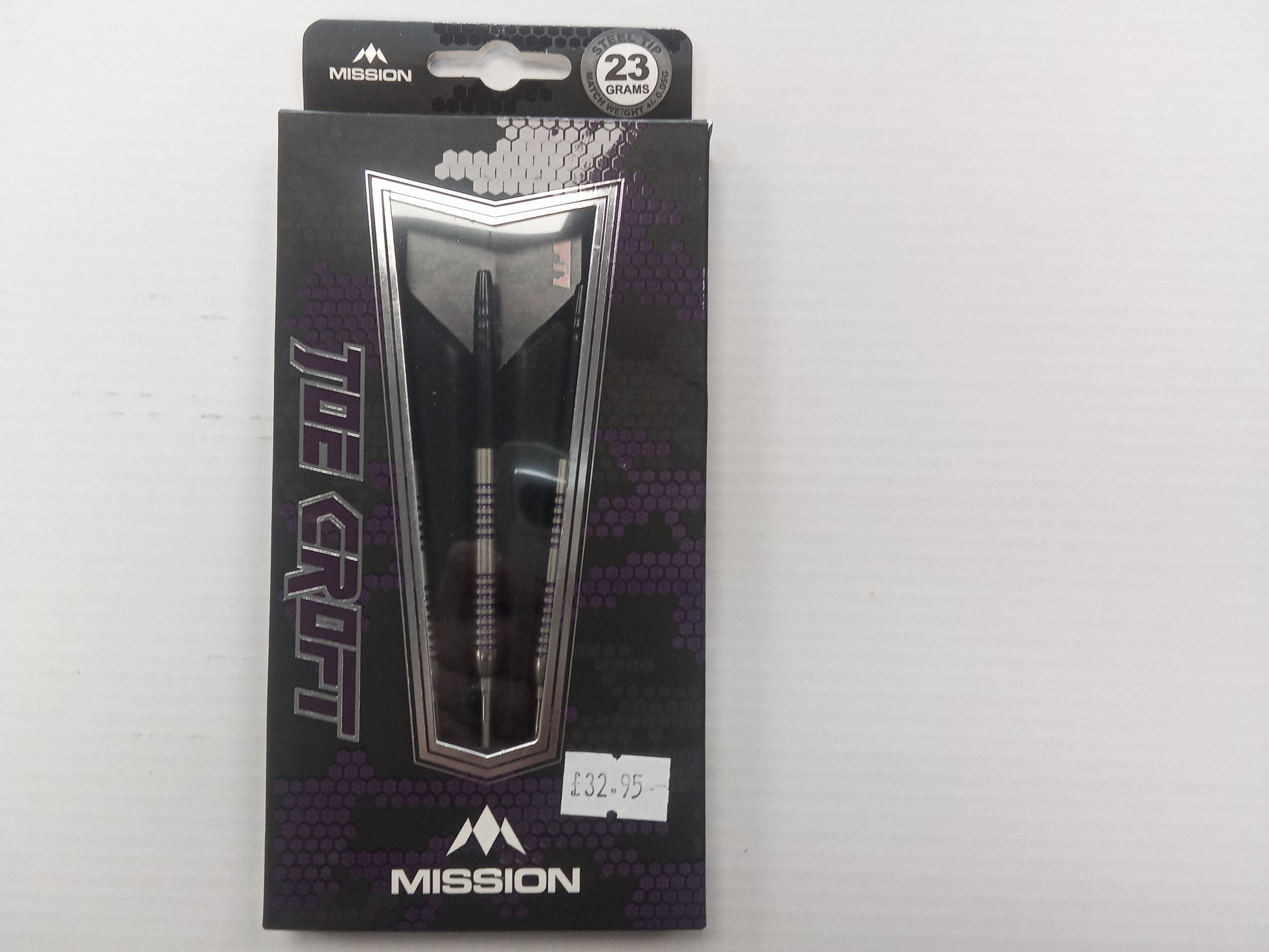 Mission Joe Croft Darts - Steel Tip - 95% Tungsten - Silver & Purple Electro-23g. Make your own history with these Joe Croft Darts. The Cheshunt ace is the grandson of the late Olly Croft, who founded the British Darts Organisation, but is making a name for himself with his performances on the oche. Croft’s first set of darts from Mission features a torpedo barrel design that incorporates a unique contour radius nose that flows into the point. The 95% tungsten barrel tapers from the front nose to the rear and is finished off with two sections of purple electro plate radial grooves on the front and rear of the barrel. The barrel leads to a Mission Sabre shaft in purple with a black top which tightly grips the flight. The dart is complete with a black point and the Mission Logo is laser-etched into the centre of the barrel.