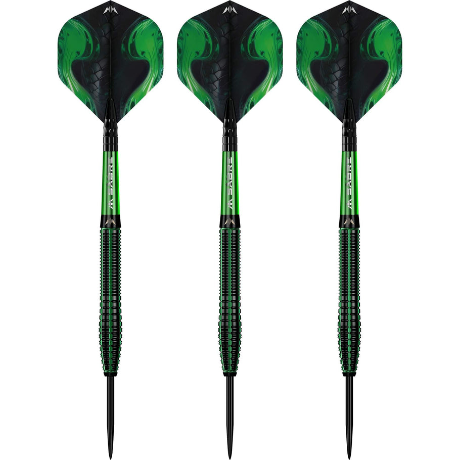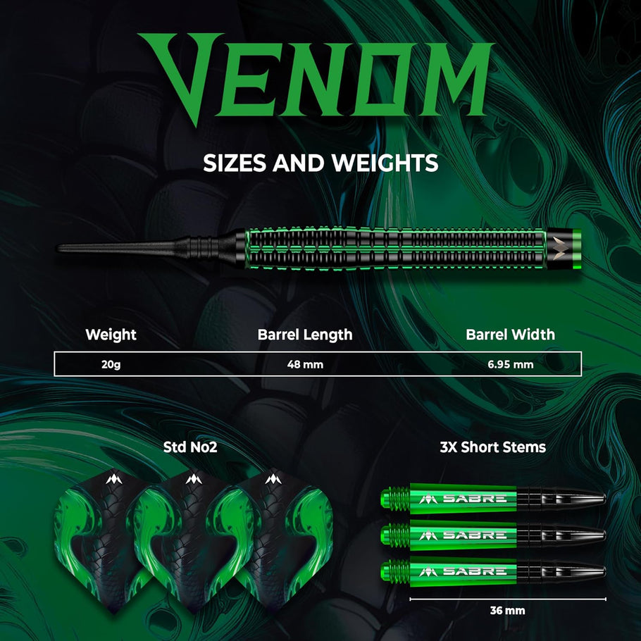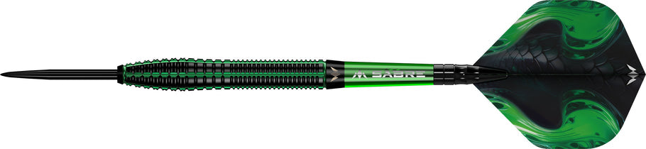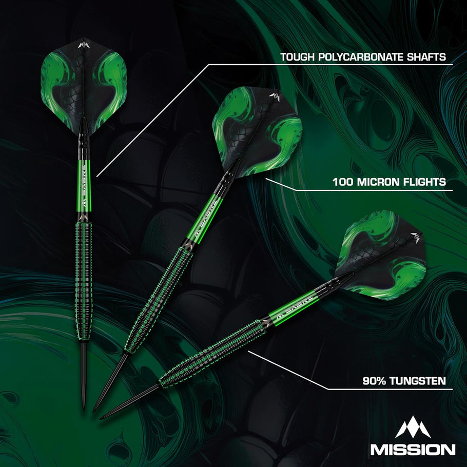 Mission Venom Darts - Steel Tip - 90% - Black & Green Electro Plated. Invade the darting world with the Mission Venom Darts. Made from 90% tungsten and featuring a stunning black PVD and green electro plate coating, the Venom dart will strike fear in every opponent. The barrel includes radial grooves and horizontal milling for an enhanced grip. A straight rear section contours into a front section with a tapered smooth bull nose that tapers to a black point. The rear of the barrel tapers naturally to a smooth section with a laser-etched Mission logo.