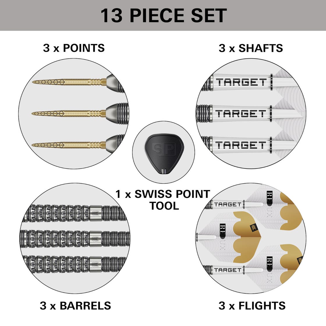 Every set comes fitted with Swiss DX points, a premium fusion of Target’s Diamond Pro and Fire point designs. The laser-etched diamond texture at the front transitions seamlessly into the machined Fire grip, offering a firm hold on the board. Thanks to the Swiss Point system, you can change points in seconds with the included SP tool—ideal for switching up your setup on the fly.