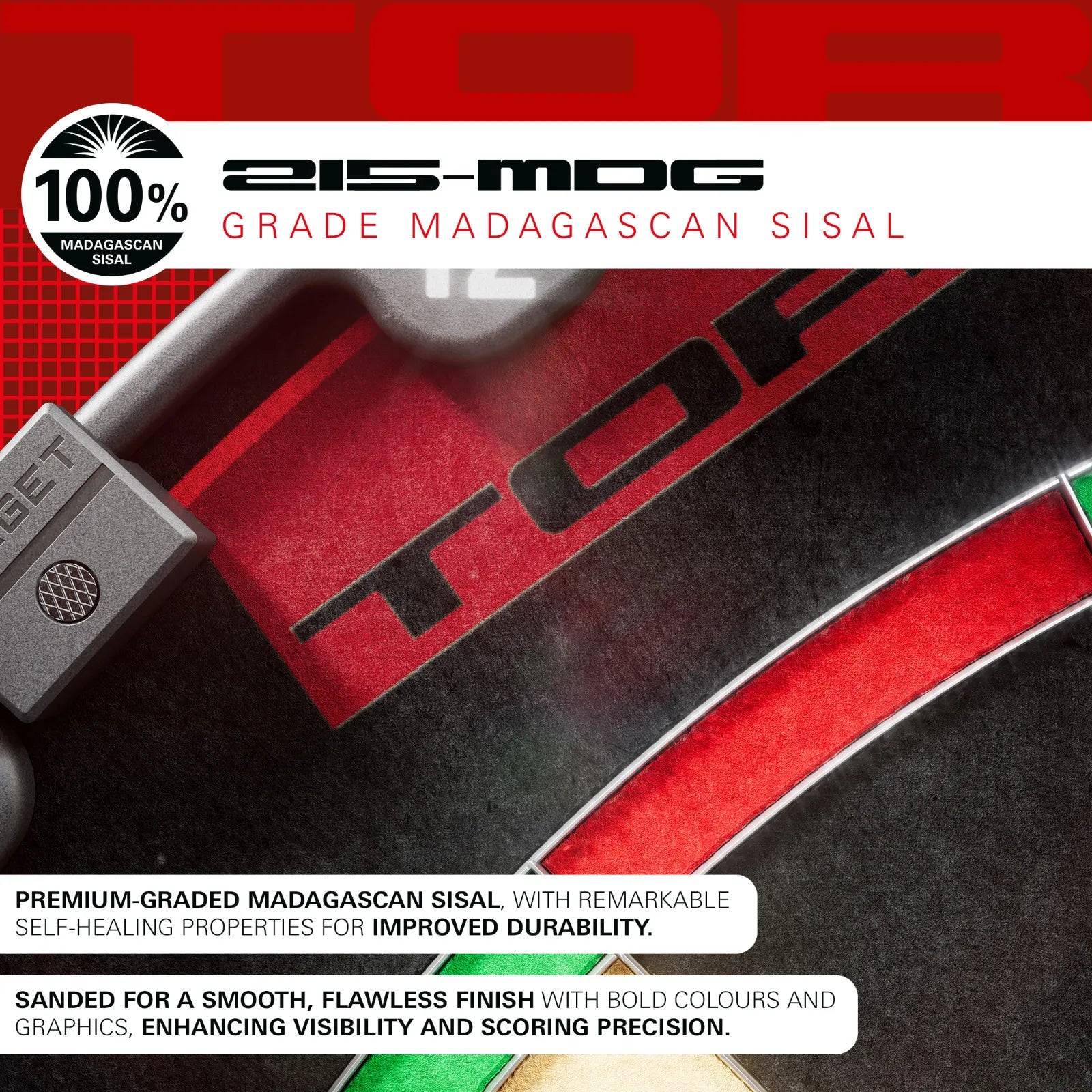 Constructed with 215-MDG premium Madagascan sisal, the board offers exceptional self-healing properties and dart retention, ensuring it remains in top condition through extensive play. Its sanded surface boasts a smooth, flawless finish with bold colours and graphics that enhance visibility and accuracy.