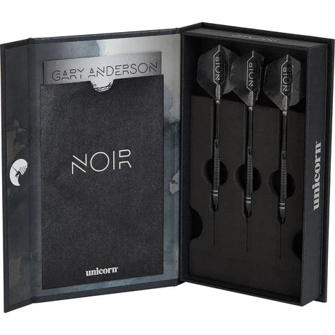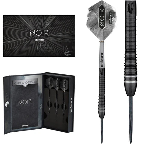 Unicorn Gary Anderson Darts - Steel Tip - The Flying Scotsman - Noir Organic - Phase 6 - 25g. Each set of these 90% Tungsten darts features a black titanium coating, some AR2 ultrafly flights, smokey gripper 4 shafts and some volute points. All packs in a stunning player edition presentation pack.