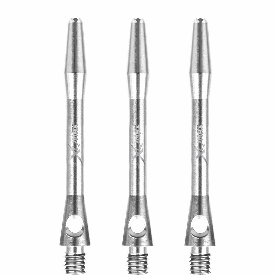 XQMax Aluminium Dart Shafts - Metal Dart Stems - Silver - Medium - 47mm. These classic aluminium dart shafts with logo, available in 3 sizes and 4 colours, are the perfect addition to complement your dart set up. Strong and durable, use with rubber O-Rings to create a firm bond between dart and shaft. Each pack contains 3 shafts.